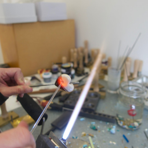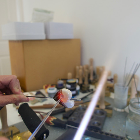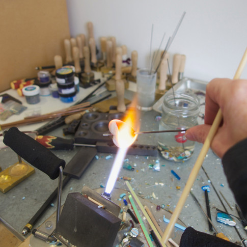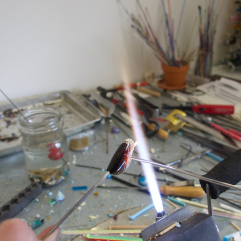 Moving it through the flame softens the glass allowing me to work it into the shape I am looking for.