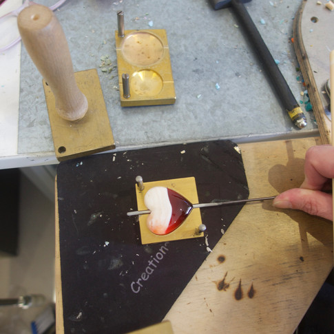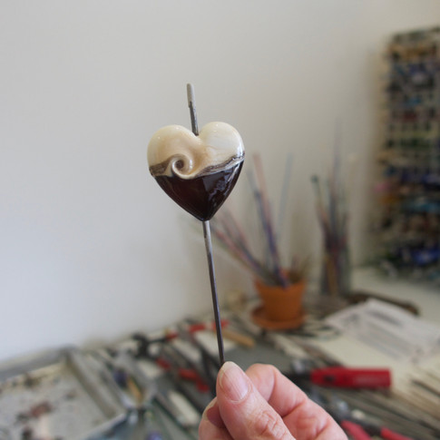 To get the swirl on the heart I take a glass stringer and while the area is super heated I insert the stringer and twist into the glass heart shape.